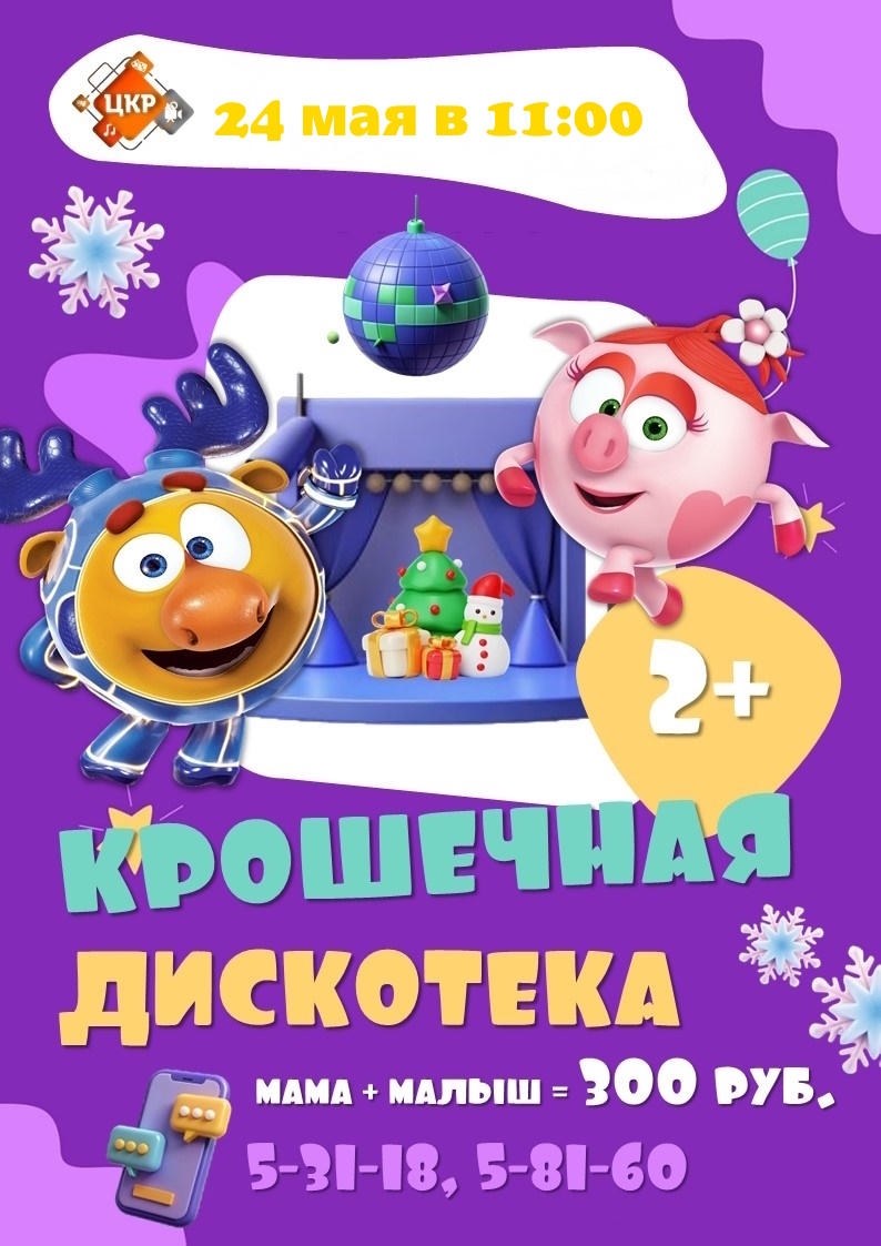 Приглашаем малышей от 2 до 8 лет на крошечную дискотеку. Вас ждёт встреча с любимыми героями мультфильмов, просмотр мультфильма с их участием, игры, конкурсы, танцы. Стоимость 300 рублей (ребенок+родители, бабушки, дедушки)